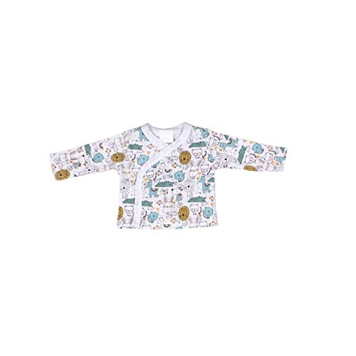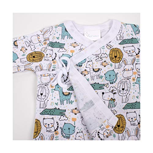 De geboorteset wordt geleverd in een mooie doos, die ideaal is als cadeau voor aanstaande ouders. De eerste set bestaat uit 100% katoen en bestaat uit een muts, twee wanten, een slabbetje, een outfit en een beenkappen, onmisbare elementen in de babyschaal. De set behoort tot de Zoo-collectie en heeft een vrolijke print. Ze zijn een must in de babyschaal, de muts helpt je tijdens de eerste levensduur geen lichaamswarmte te verliezen, de handschoenen voorkomen dat het gezicht bekrast wordt en het slabbetje wordt een onmisbaar onderdeel in elke opname. Het babyhemd kan aan de voorkant worden aangetrokken om het aantrekken te vergemakkelijken. Inhoud: 1 paar washandjes, 1 slabbetje, 1 muts, 1 hemd en 1 beenkappen