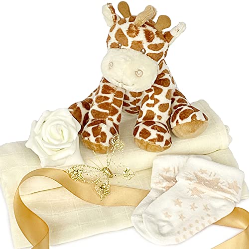 Inclusief 9 premium luiers, 2 paar sokken en een prachtig mousseline vierkant, gegarneerd met een het schattigste Baby Giraffe zacht speelgoed, waardoor het ideale neutrale babycadeau wordt gecreëerd