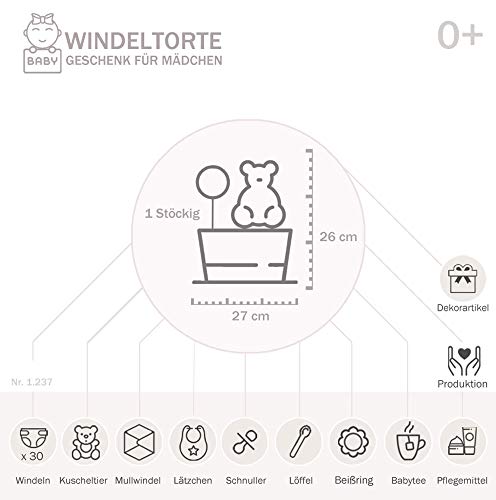 Afmetingen: ca. 26 cm hoog en 27 cm breed. De babytaart wordt verpakt in een geschenkfolie en gedecoreerd met een leuke strik geleverd.